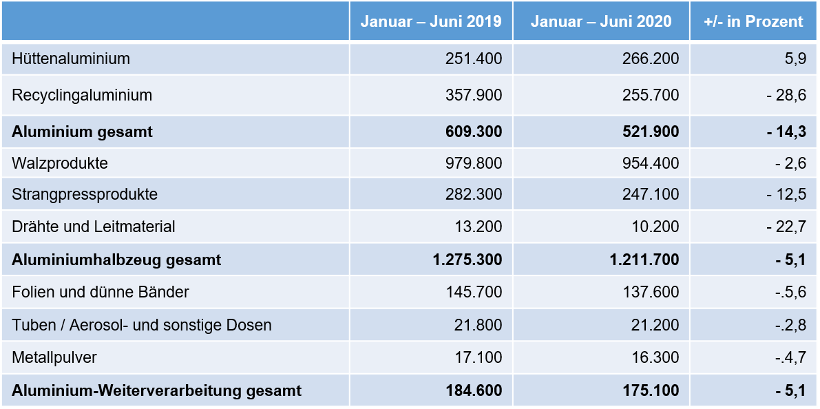 Deutsche Aluminiumindustrie schränkt Produktion im ersten Halbjahr 2020 in allen Bereichen ein / leichte Belebung im zweiten Halbjahr erwartet / Handelskonflikte bleiben bestehen
