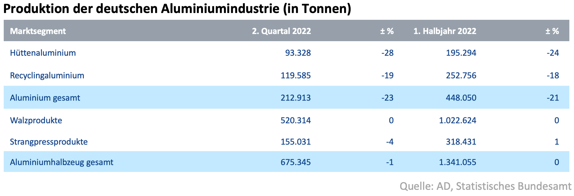 Die Produktion von Aluminium in Deutschland ist im zweiten Quartal 2022 teils deutlich gesunken. Mit einem Rückgang von 23 Prozent schrumpfte die Herstellung von Rohaluminium besonders stark. Nach dem ersten Halbjahr 2022 steht hier ein Minus von gut einem Fünftel (-21 Prozent) auf 448.000 Tonnen zu Buche. Der Strompreis hat jüngst ein neues Rekordniveau erreicht und stellt gerade die stromintensiven Aluminiumhütten in Deutschland vor existentielle Herausforderungen.